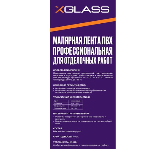 Лента клейкая малярная XGLASS ПВХ, 50 мм, 33 м 160551