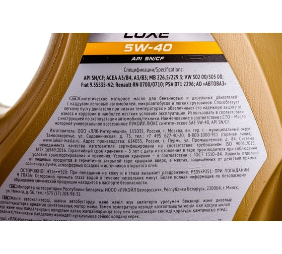 Моторное масло Лукойл ЛЮКС синтетическое SAE 5W-40, API SN/CF, 4 л 207465