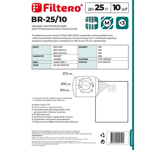 Мешок BR-25/10 25 л, 10 шт для пылесоса Bort, Зубр, Калибр FILTERO 02059