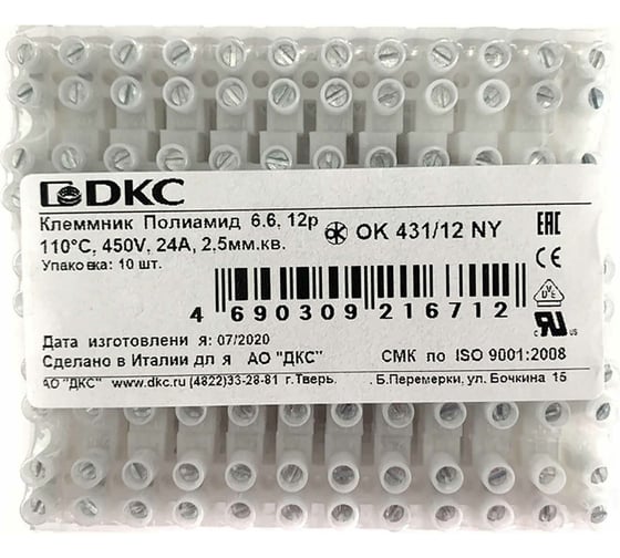 Клемник 6.6, 12р, 110°С,4 50V, 24A, 2,5кв.мм. DKC 43212NY