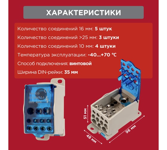 Керамическая винтовая клемма REXANT 2 пары 16 мм2 с крепежным отверстием 50 шт 07-6224