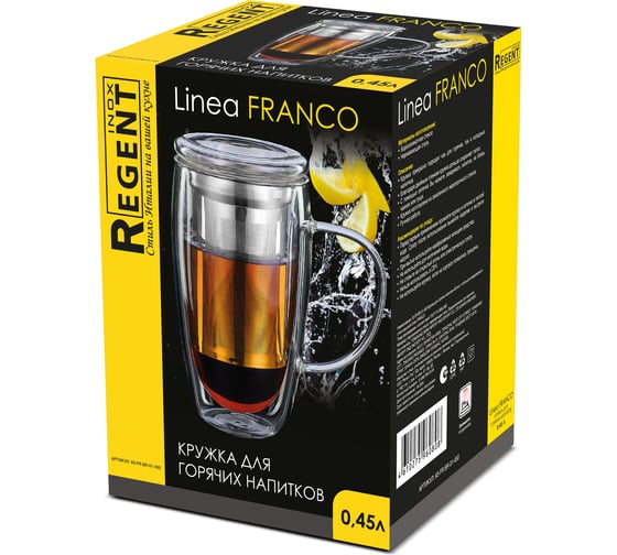 Кружка для горячих напитков Regent inox 450 мл, с ситом для заваривания и стекл.крышкой Linea FR 93-FR-BR-01-450