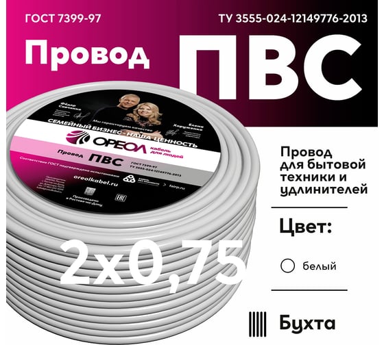 Провод Севкабель ПВС 2х0,75 мм, ГОСТ, 100 м 05503