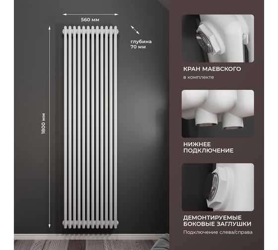 Вертикальный стальной радиатор GUARDO Pilon 300x1464 мм, 32 секций, S=16м², нижнее с вентилем подключение 3T-0300 32 NKV
