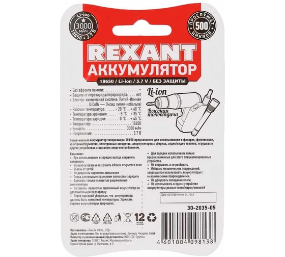 Аккумулятор REXANT 18650 Li-ion 2600 mAH 3.7 В без защиты 30-2020-01