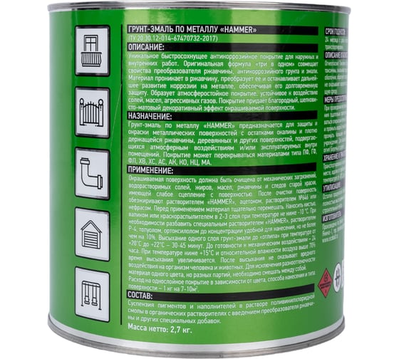 Грунт-эмаль по ржавчине Hammer 3 в 1 б/с п/мат RAL 7040 серое окно 520 мл 12 ЭК000142481