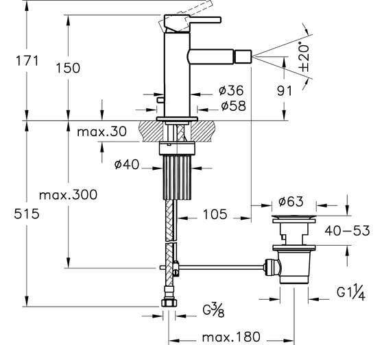 Смеситель для биде Hansgrohe Tecturis S 80, однорычажный, со сливным гарнитуром 73201000
