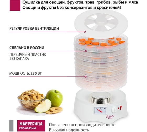 Сушилка для овощей и фруктов Мастерица efd-0903vm, 9 поддонов, 280 вт 00-00033405
