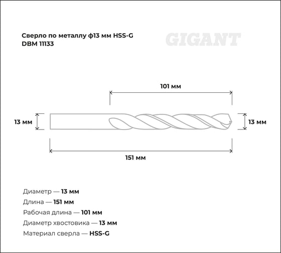 Сверло по металлу HSS-G (13х151х101 мм) Gigant DBM 11133