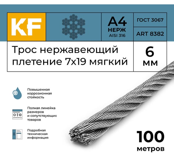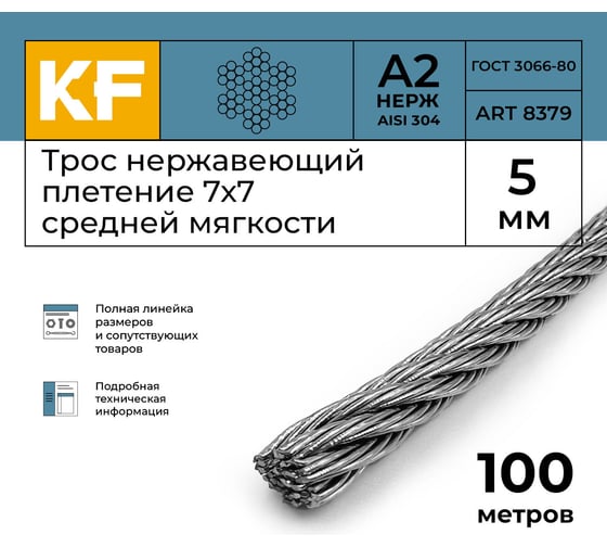 Нержавеющий трос KREPFIELD 5 мм, сталь А2, плетение 7x7, средней мягкости, 100 м 8379А2ТРОС5ММ-100