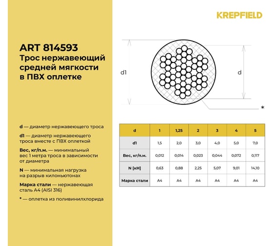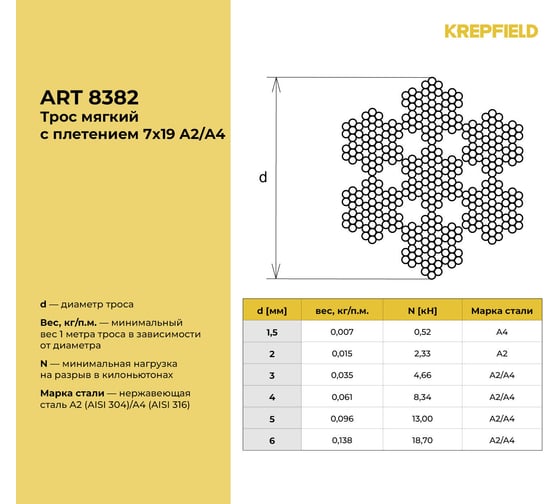 Трос для растяжки КРЕП-КОМП ART 8379, нержавейка А2, 7х7, 4 мм, 250  м трн4