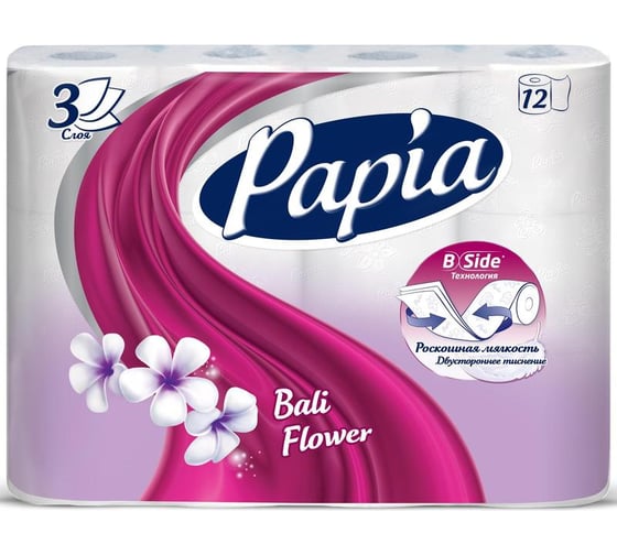 Туалетная бумага PAPIA HAYAT цветы Бали, 3 слоя, 12 рулонов, белая 1/7