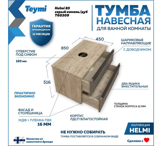 Тумба под раковину AQUATON Оливия 70 грей, дуб ойстер 1A254301OLUG0