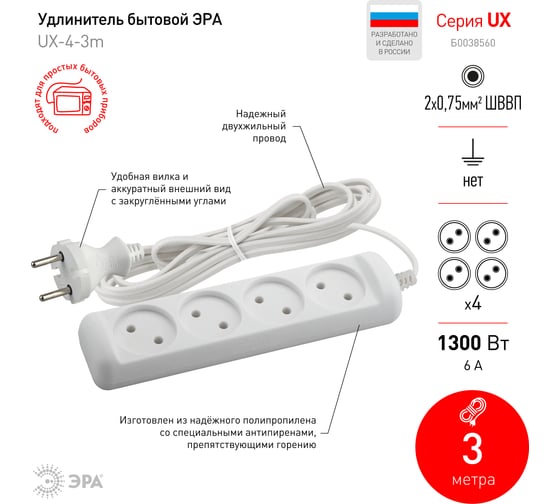 Удлинитель У6-766 ШВВП 2x0,75 4гн. 3м UNIVersal 9631943